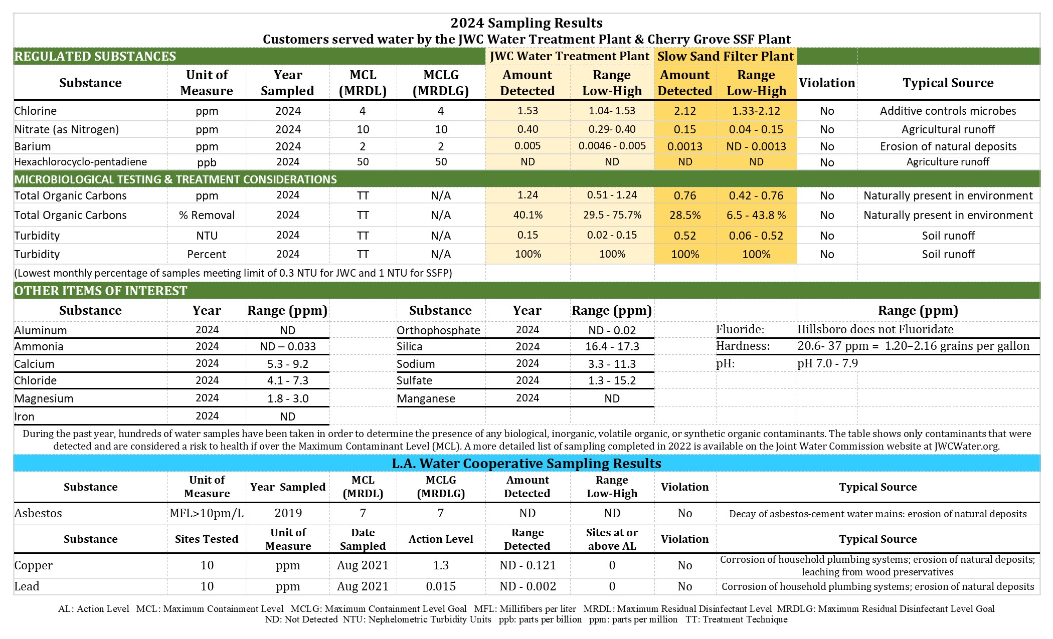 L. A. Water Cooperative is committed to providing you with a safe and reliable supply of high-quality drinking water. Each year, the co-op produces an annual Water Quality Report which meets the Federal Safe Drinking Water Act requirements for ‘Consumer Confidence Reports’. This report contains information on the source of our water, lists the results of our tests, and contains important information about our water and health. The reports are due by July of each year and are usually included with your monthly bill in June. Please read this report carefully and, if you have any questions, email our office or call (503) 662-3899.